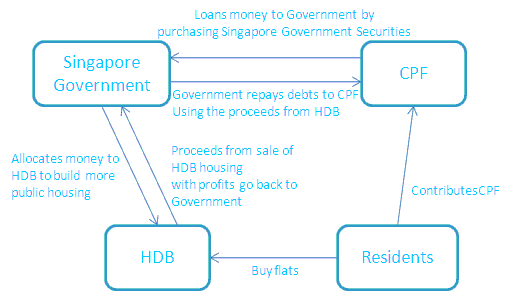 The answer is an ingenious plan by the Government to create a money flow cycle to fund public housing. CPF was created as a pension funds and the funds belongs to the contributors (CPF Board acts like a bank in this case) and not the Government. In order for the Government to use the fund in CPF, they have to ‘borrow’ from it. When Singapore was separated from Malaysia Federation, there were fears that Singapore would not make it and that fear could trigger a mass exodus. Hence the Government borrowed money from CPF by issuing bonds and used the money to developed public housing through Housing Development Board (HDB). People who have invested in housing and a home would stay committed to Singapore. The houses were then sold to the people at a comfortable rate to repay the debt and interest owed to CPF board. The cycle continues to present day and as the Government invests more and more on public housing, it borrows more from CPF and that explains the high public debt.